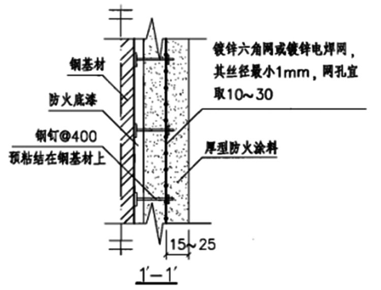 根据《建筑钢结构防火技术规程》GB51249-2017第4.2.1条,钢结构采用喷涂非膨胀型防火涂料保护时,有下列情况之一时,宜在涂层内设置与钢构件相连接的镀锌铁丝网或玻璃纤维布:1 构件承受冲击、振动荷载;2 防火涂料的黏结强度不大于0.05MPa;3 构件的腹板高度大于500mm且涂层厚度不小于30mm;4 构件的腹板高度大于500mm且涂层长期暴露在室外。相关做法可参考《06图集》第11页: