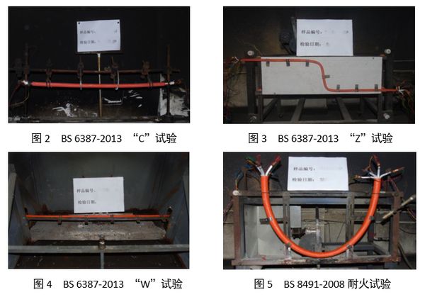 除国标GB/T 19216以外,英国的BS 6387和BS 8491也是国内电缆企业常常选择的评价标准。这两个英国标准要求比GB/T 19216更加严格,耐火试验除了满足高温受火条件外,还增设了机械应力冲击破坏和水冲击破坏试验项目。图2、图3和图4依次是按BS 6387所述的C(单纯耐火)试验、Z(耐火+冲击)试验和W(耐火+水冲击)试验照片,图5是BS 8491所述的(耐火+机械冲击+水冲击)试验照片。近年来,国内部分电缆企业也依据这两部英国标准进行试验,图6统计了2016年~2020年间我中心受理耐火电缆耐火试验方法的选择情况。