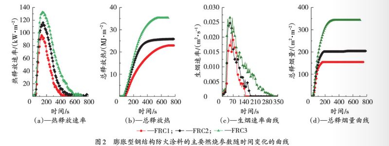 膨胀型钢结构防火涂料的主要燃烧参数随时间变化的曲线见图2,主要燃烧参数峰值热释放速率(PHRR)、总释放热(THR)、峰值生烟速率(PSPR)和总释烟量(TSR)见表1。